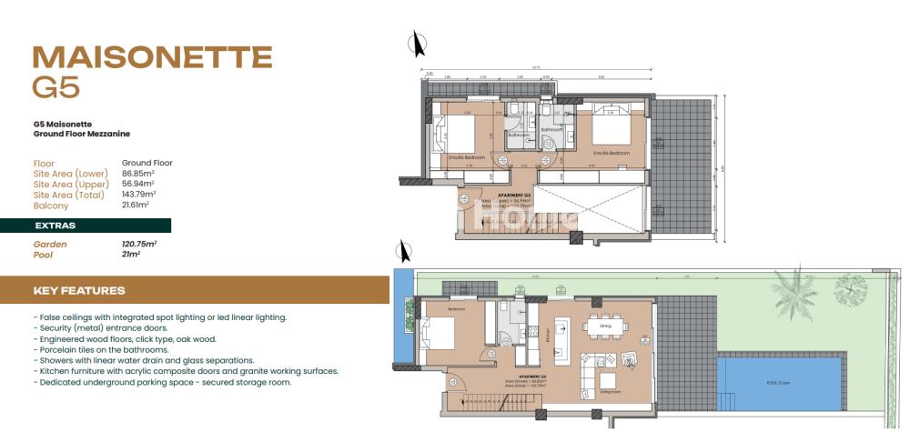 Excellent ground floor-1st floor maisonette in Golf in a very good location, year construction 2025-2026 with its own garden with swimming pool, 3 bedrooms with 3 bathrooms, one bedroom with the bathroom is on the ground floor of the maisonette and the other 2 masters on the upper floor. It has underfloor heating, parking space in basement and storage room and gym.