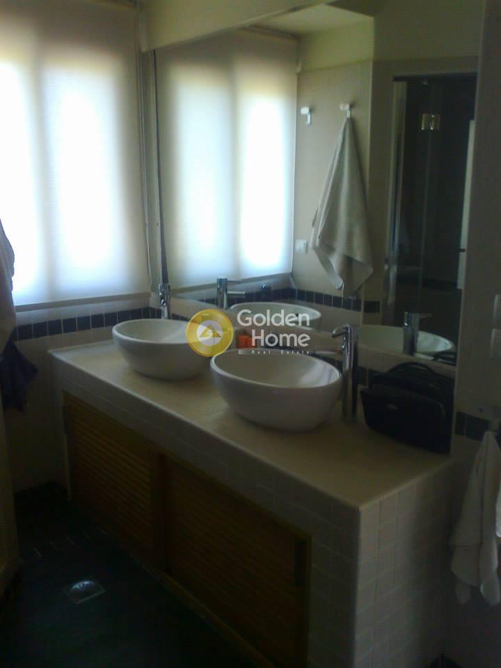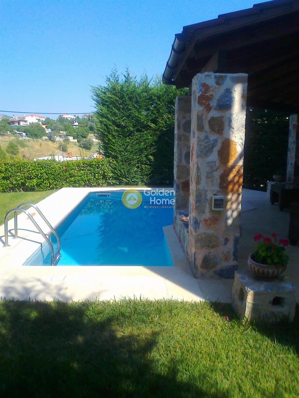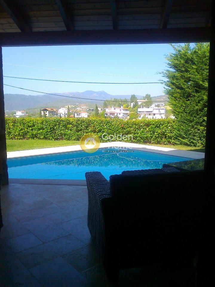 Excellent detached house of 330 sqm (200 main building + 130 playroom) on a plot of 360 sqm, built in 2007. It has 3 bedrooms (1 master) plus 1 guest room, 1 office, 2 kitchens, 3 bathrooms, 1 wc, very large internal storage but and external, energy fireplace. It also has a security door, alarm, boiler, electric shutters, colored aluminum with triplex windows and oil and pellet burners. In the surrounding area there is a landscaped garden with a view, a stone built bbq and a swimming pool with electrolysis. It also has 4 parking spaces. Close to the market, schools and transport while it is 30 minutes from the beach of Agioi Apostoli