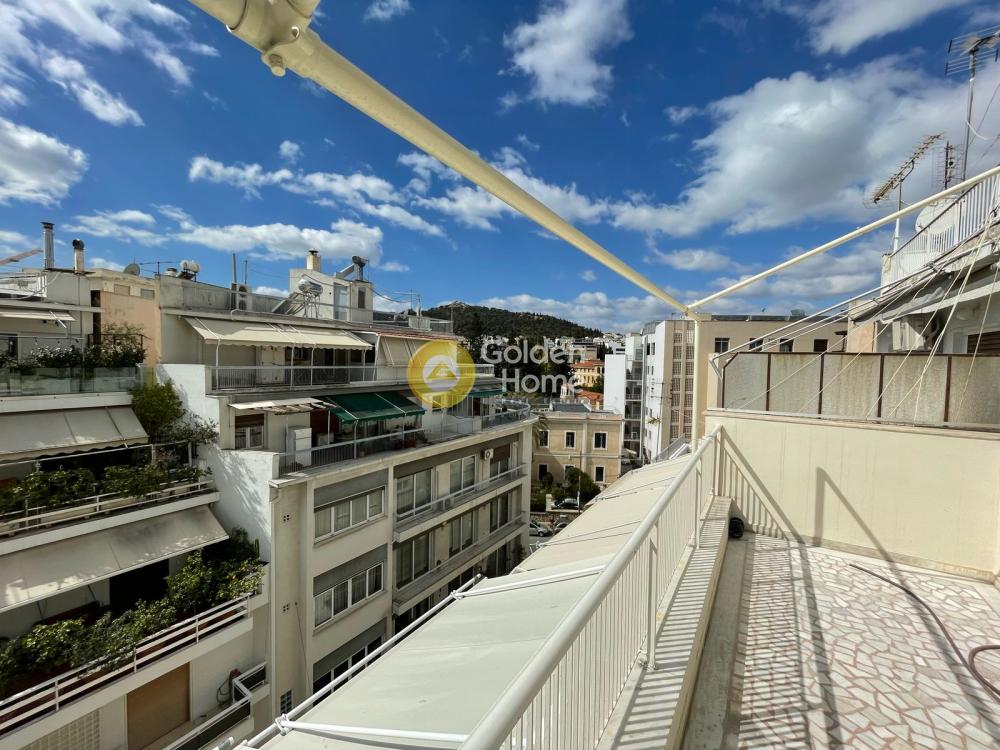 MAVILI SQUARE, in a privileged location, unique Penthouse of 100 m2, 5th floor (floor apartment), bright, with a large terrace along the entire facade of the building, 16 meters, with a view of Lycabettus. A complete renovation has just been completed (PEA: B+). It consists of a living room, Open Plan kitchen (with stove and extractor), two Master bedrooms with bathrooms (En-Suite), WC, storage on the terrace and on the roof. The renovated apartment has new energy-efficient windows, electric shutters, wooden and vinyl floors, marble fireplace, gas central heating, 3 air conditioners, security door, awnings, and a full alarm system. PARKING: At a distance of 30 meters, there is a 24-hour parking lot with a reasonable monthly rent.