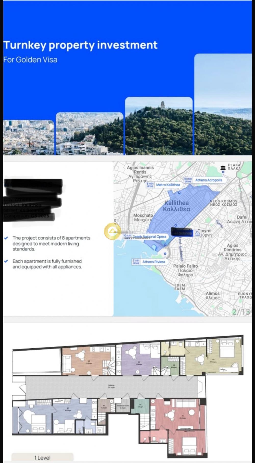 Investor Benefits Fast Process From decision to Golden Visa application in as little as 1 month. Transparent Product Clear understanding of yields and profitability in the context of the whole market. Delay compensation If construction is late, we cover the lost rental income. Warranty Post-construction completion work and materials guarantee for each apartment. 100% legally verified Full compliance and risk-free ownership. High-quality finishes & furnishing Clientscan experience it first-hand during viewings in Athens, with complimentary stay and no obligation to buy. Full Turnkey Service (if needed) Property acquisition / Accommodation in Athens / Golden Visa application support / Property management / Tax handling during ownership.
