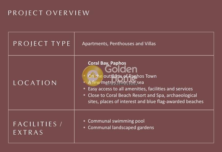 75,63m2 Covered area / 8,60m2 Cov. verandas / 84,23m2 Total cov. area EXTRAS : Communal swimming pool / Communal landscaped gardens DESCRIPTION : Nestled on the outskirts of Paphos Town in the enchanting Coral Bay, this project offers a lifestyle of unparalleled sophistication and contemporary elegance. Meticulously designed with a keen eye for detail, these residences stand as a testament to architectural finesse, blending modern aesthetics with the warmth of a Mediterranean atmosphere. The development provides easy access to the crystal-clear waters of the sea, inviting residents to embrace a coastal living experience enriched by the beauty of the surrounding landscape. Immersed in a tapestry of natural beauty, the project introduces a harmonious blend of communal amenities and private sanctuaries. The communal swimming pool and meticulously landscaped gardens create spaces for relaxation and socializing, while the nearby Coral Beach Resort and Spa, archaeological sites, and blue flag awarded beaches beckon exploration. The thoughtful integration of these elements fosters a sense of community while allowing residents to enjoy the serenity of their private retreats. LOCATION : Coral Bay, Paphos / On the outskirts of Paphos Town / A few metres from the sea / Easy access to all ameni es, facili es and services / Close to Coral Beach Resort and Spa, archaeological sites, places of interest and blue flag-awarded beaches