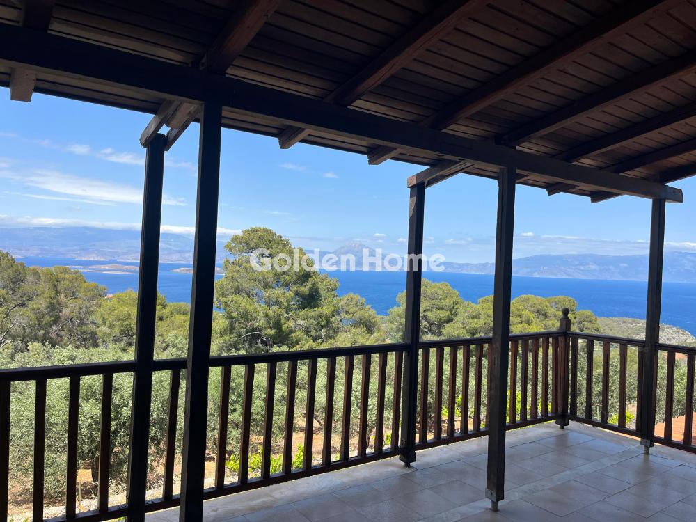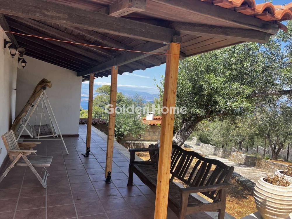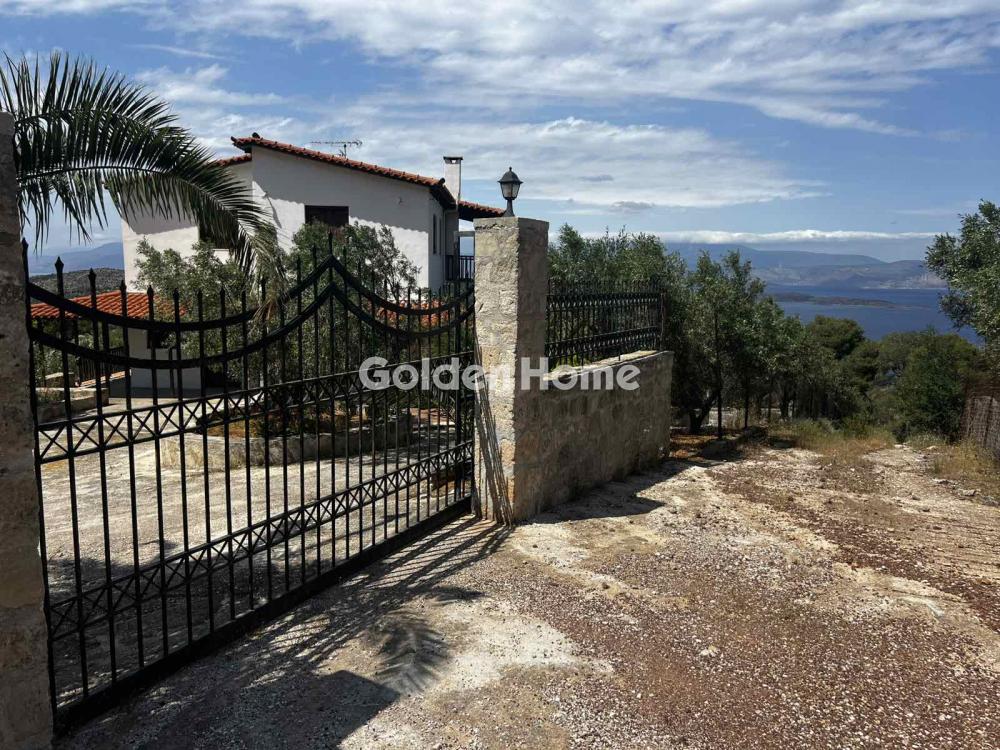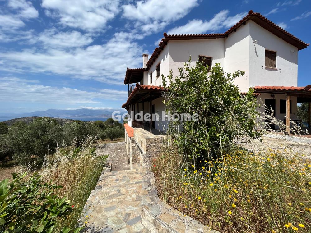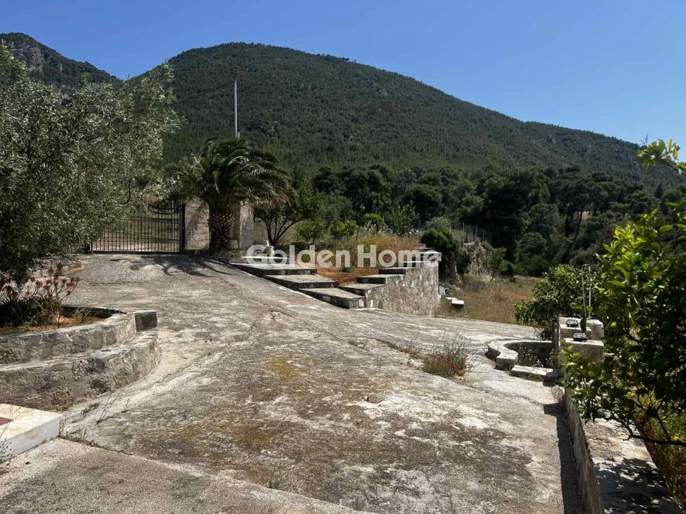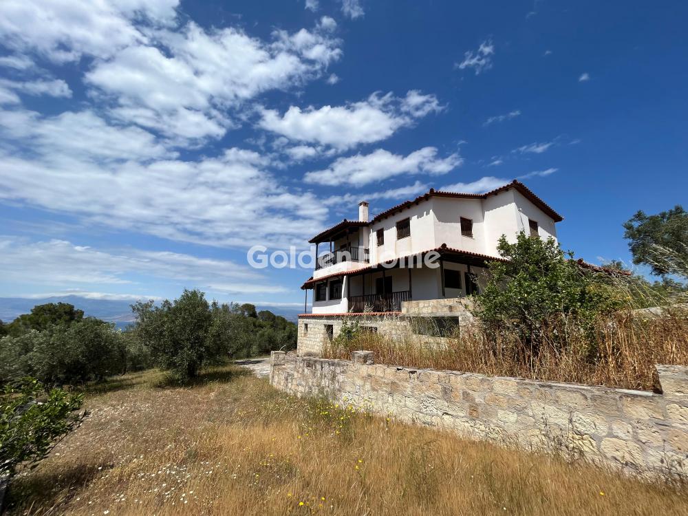 Loutraki, Schinos - Duplex house 420 sqm, on a plot of 4600 sqm, 2 levels: ground floor - 1st floor, construction 1985, kitchen, bathroom, wc, with open parking space, quiet, bright, corner, mountain view, sea view, frontage, storage room 10sqm, fireplace, large terraces, garden 1000sqm, with 50 olive trees, tiled floors, security cameras, south orientation, close to the beach, price negotiable.