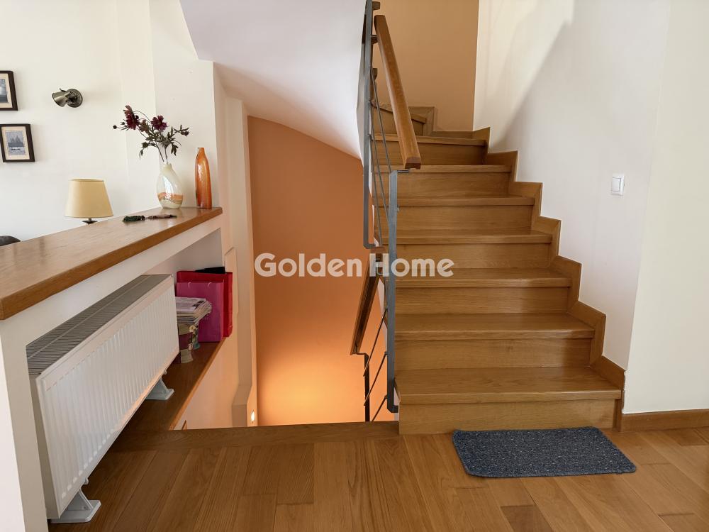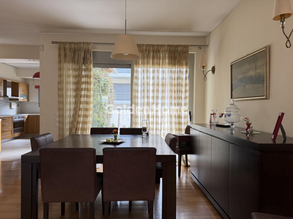 A 4-level furnished maisonette of 193 sq.m., airy, with a garden, in a quiet location with lots of greenery. Built in 2005, with a minimal aesthetic, it consists of 4 levels connected by an internal staircase. On the ground floor, there is a living room with a fireplace, open to the dining area, the kitchen, and a WC. On the first floor, there are two bedrooms with a balcony, a large bathroom, and storage space. On the second floor, there is a space that can be used as an office or bedroom, with a bathroom, balcony, and plenty of closets. The semi-basement can function as a playroom and guest area, consisting of a living room with kitchen, bedroom, bathroom, and storage space. The house is furnished and equipped with independent heating and an alarm system.