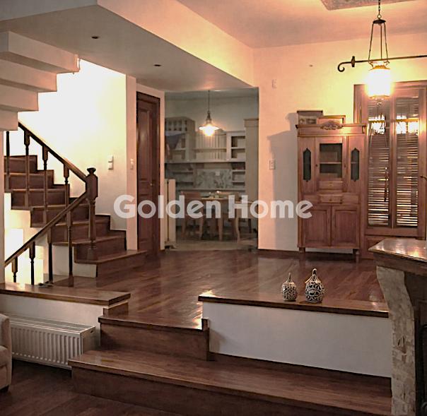 For rent: a 260 sq.m. detached house in Saronida. The residence is arranged over three levels and includes four spacious bedrooms, two bathrooms, a guest WC, two living rooms with fireplaces, a garden and a pool. Large openings bring in natural light and offer views toward the sea, while the outdoor areas connect directly with the interior. On the first floor, at the main entrance, there is the central living room with a fireplace and access to the attic, which can serve as an additional sitting area or office. The wooden flooring continues throughout the level and leads to the next section of the house. A few steps up is the dining area and the kitchen in soft blue tones, along with the guest WC. The kitchen opens to a covered semi‑outdoor space that leads directly to the garden. The second floor includes two spacious bedrooms that share the bathroom of the level, which features a whirlpool bathtub. On the ground floor there is a second living room with a fireplace, two additional spacious bedrooms that share the second bathroom, as well as a utility/storage room. This level offers direct access to the garden and the pool. The property includes a pool, surrounding garden, rock garden at the entrance, two fireplaces, whirlpool bathtub, wooden floors in the main areas, cotto‑style tiles on the ground floor, large openings and a covered semi‑outdoor area with access to the garden.