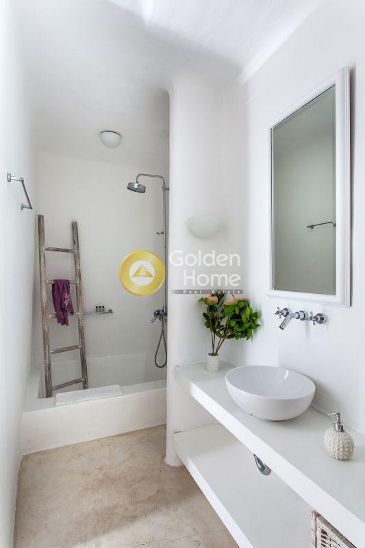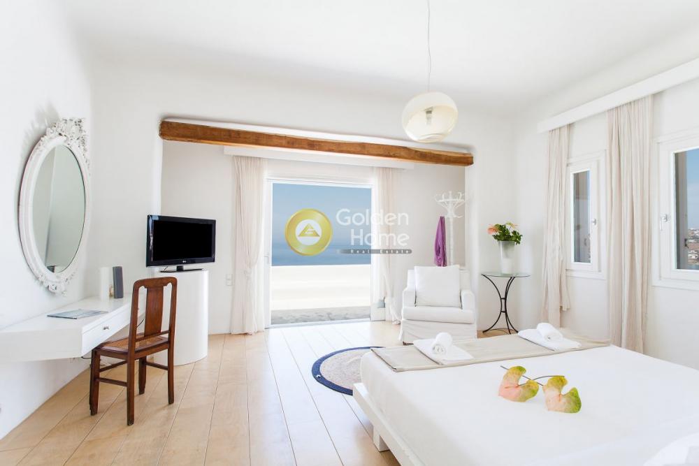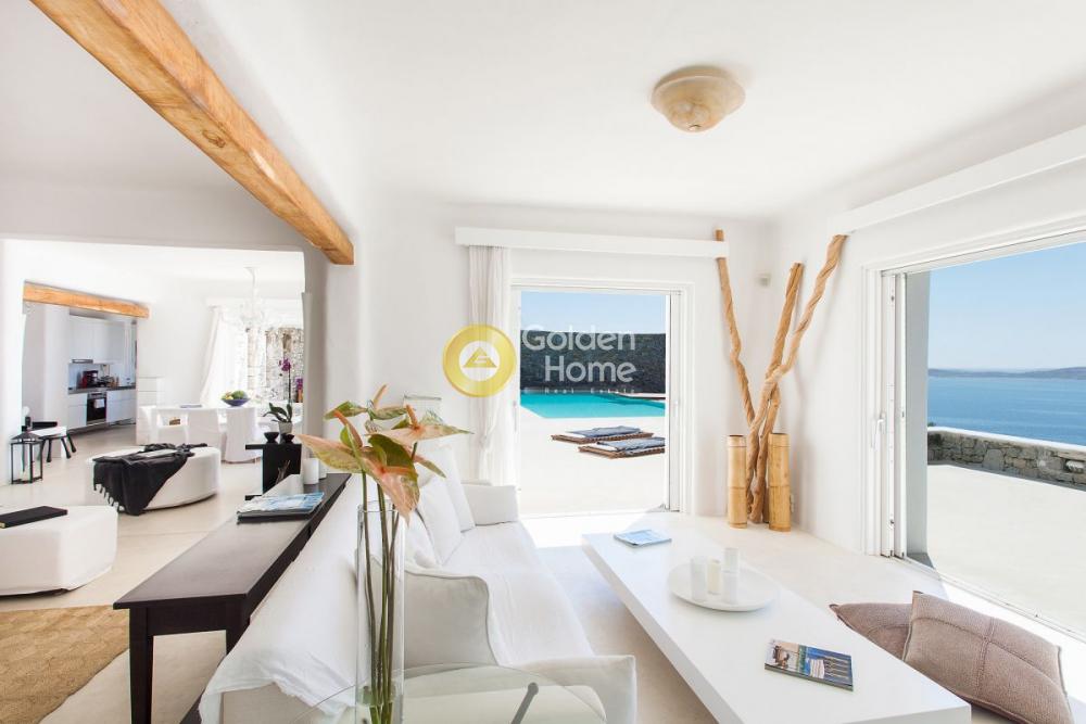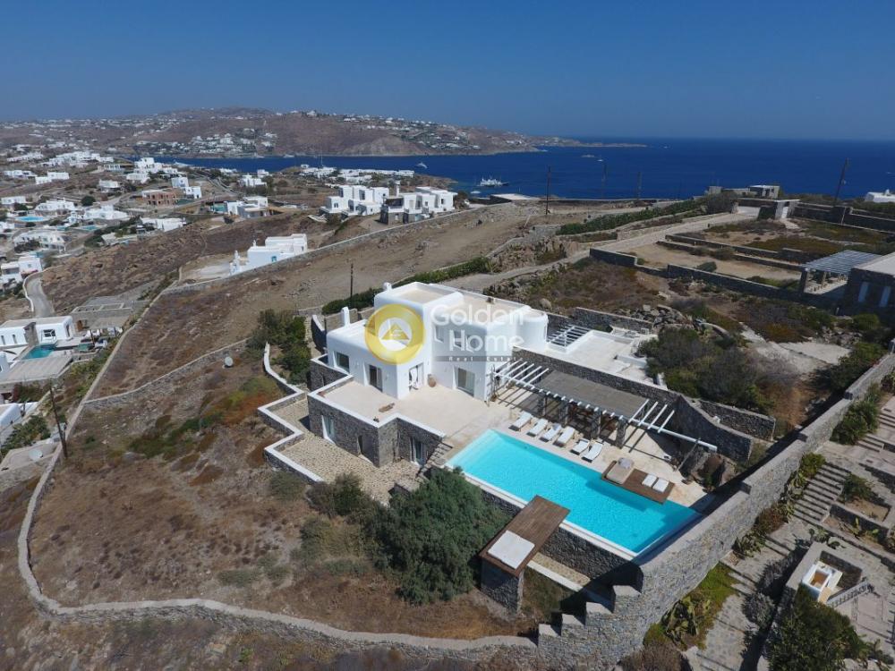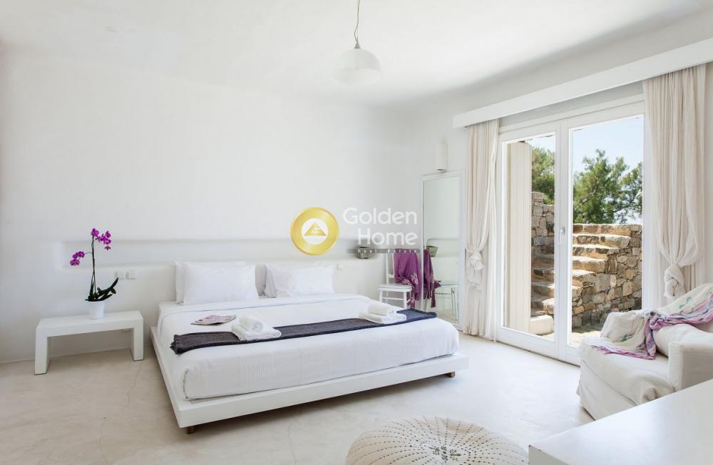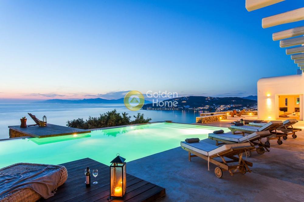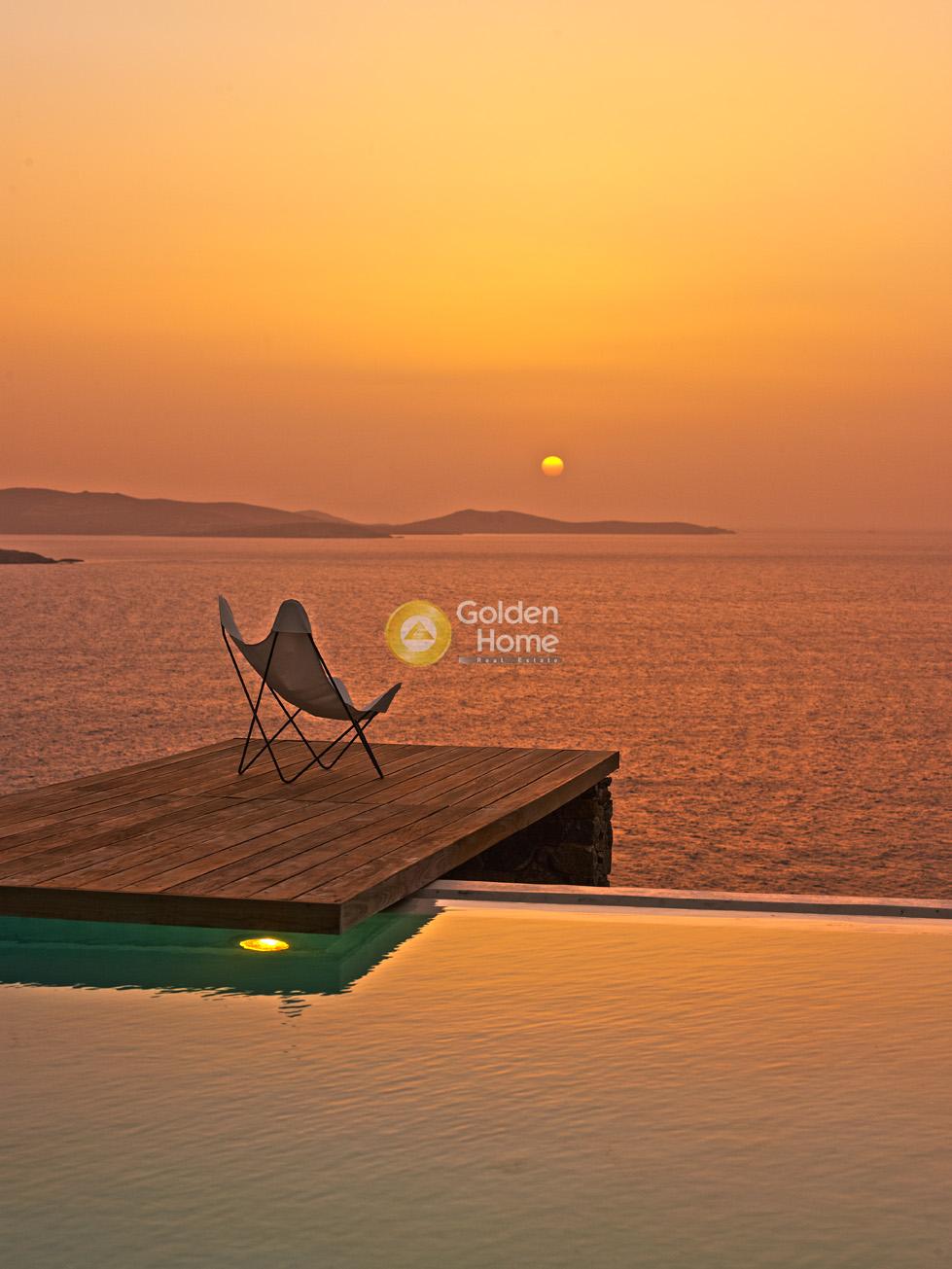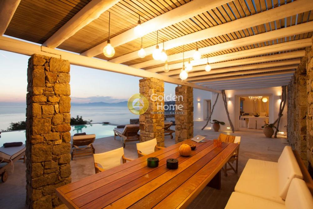 This luxurious villa is suited in Aleomandra, a location that provides one of the best sunset views on the islandas well as it overlooks the island of Delos. It is built in accordance with Myconian architecture, combining stunning seaviews, elegant minimalist architecture and modern chic decor with traditional undertones. The villa consists of 5 spacious and comfortable bedrooms, each one with its own private bathroom, a kitchen, a dining area and a sitting room. Detached from the home, a beautiful guest house is just off the entrance and shares wonderful back terraces. Regarding the exterior of the villa, there is a gorgeous infinity pool and glamorous exterior spaces with wooden decks and shaded lounge areas.
