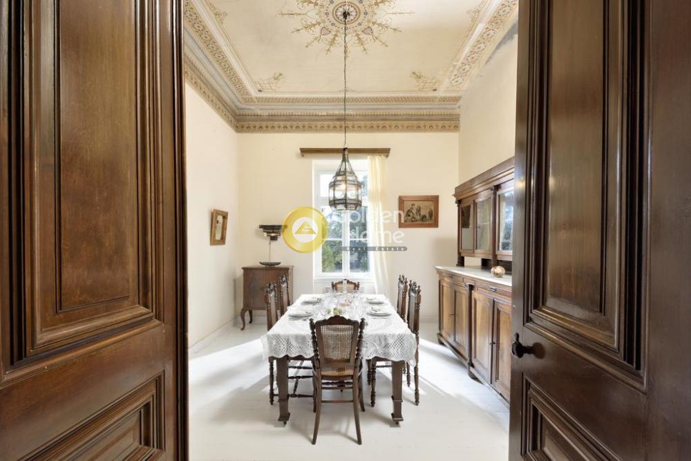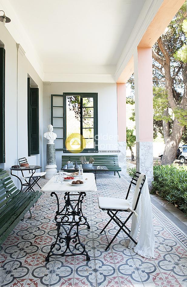 βρίσκεται μέσα στο ανωτέρω κτήμα-ελαιώνα με φροντισμένους κήπους και αιωνόβια πεύκα .Χτισμένη το 1880 έχει πλήρως ανακαινισθεί αλλά έχει διατηρήσει τη παλιά της φυσιογνωμία και αίγλη με τα ψηλοτάβανα μεγάλα δωμάτια και τα ζωγραφισμένα από Ιταλούς καλλιτέχνες ταβάνια. Έχει χαρακτηρισθεί ΄΄ έργον τέχνης ΄΄ από το υπουργείο Πολιτισμού με το σκεπτικό ότι αποτελεί «έκλεκτικό οίκημα, χαρακτηριστικό δείγμα των επαύλεων των αρχών του 1900, με ιδιαίτερο αρχιτεκτονικό ενδιαφέρον». Με έξι υπνοδωμάτια, σαλόνι, τραπεζαρία, 2 μπάνια, κουζίνα, εσωτερική στέρνα, βεράντες και εξαιρετικούς υπαίθριους χώρους, η διώροφη εξοχική αυτή οικία βρίσκεται, μαζί με το κτήμα 22 στρέμματα, σε απόσταση αναπνοής από τις υπέροχες και πάμπολλες παραλίες της Ερμιονίδας. Η βίλα χρησιμοποιείται συνεχώς, από τότε που χτίστηκε , ως εξοχική κατοικία. Η απόσταση από Αθήνα είναι 2,15 ώρες με το αυτοκίνητο, και 2 ώρες με το ιπτάμενο. Απέχει από την Επίδαυρο τρία τέταρτα οδικώς, από Ύδρα 20 λεπτά με το ιπτάμενο, από Π.Χέλι ένα τέταρτο οδικώς και από Σπέτσες μισή ώρα. Περιτοιχίζεται από πέτρινη ψιλή μάντρα, είναι όλο επίπεδο και φυτεμένο, με πλήρες αρδευτικό σύστημα από ιδιόκτητο πηγάδι και λειτουργεί μονάδα 20kw φωτοβολταικού συστήματος. Εκτός της κυρίας οικίας , μέσα στο κτήμα υπάρχουν μία παλιά υπαίθρια στέρνα και ένα σπίτι επιστάτη χρήζουν επισκευής.