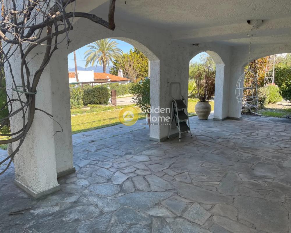 Διώροφη μονοκατοικία 144 τ.μ. με ξεχωριστή αποθήκη 19 τ.μ. σε γωνιακό οικόπεδο 795 τ.μ. 50 μέτρα από την παραλία. Ο πάνω όροφος 103 τ.μ. αποτελείται από 2 υπνοδωμάτια μπάνιο κουζίνα, σαλόνι με τζάκι και τραπεζαρία. Ο κάτω όροφος 41 τ.μ. είναι ανεξάρτητο στούντιο με τζάκι, κουζίνα και μπάνιο. Έχει μεγάλες βεράντες, ωραίο διαμορφωμένο κήπο στο μπροστινό μέρος και μεγάλη αυλή στην πίσω πλευρά όπου βρίσκετε και η αποθήκη 19τμ. Διαθέτη ανοιχτή θέση παρκινγκ που χωράει 3-4 αυτοκίνητα.