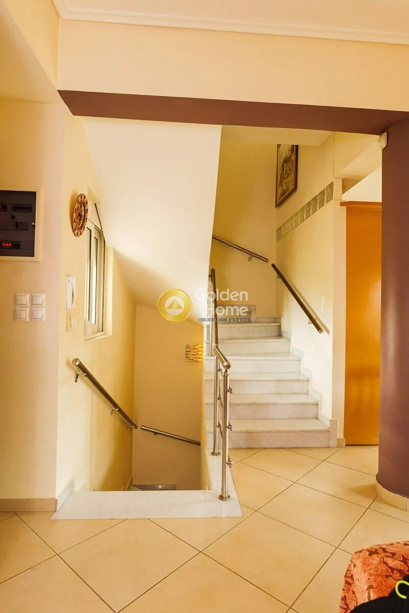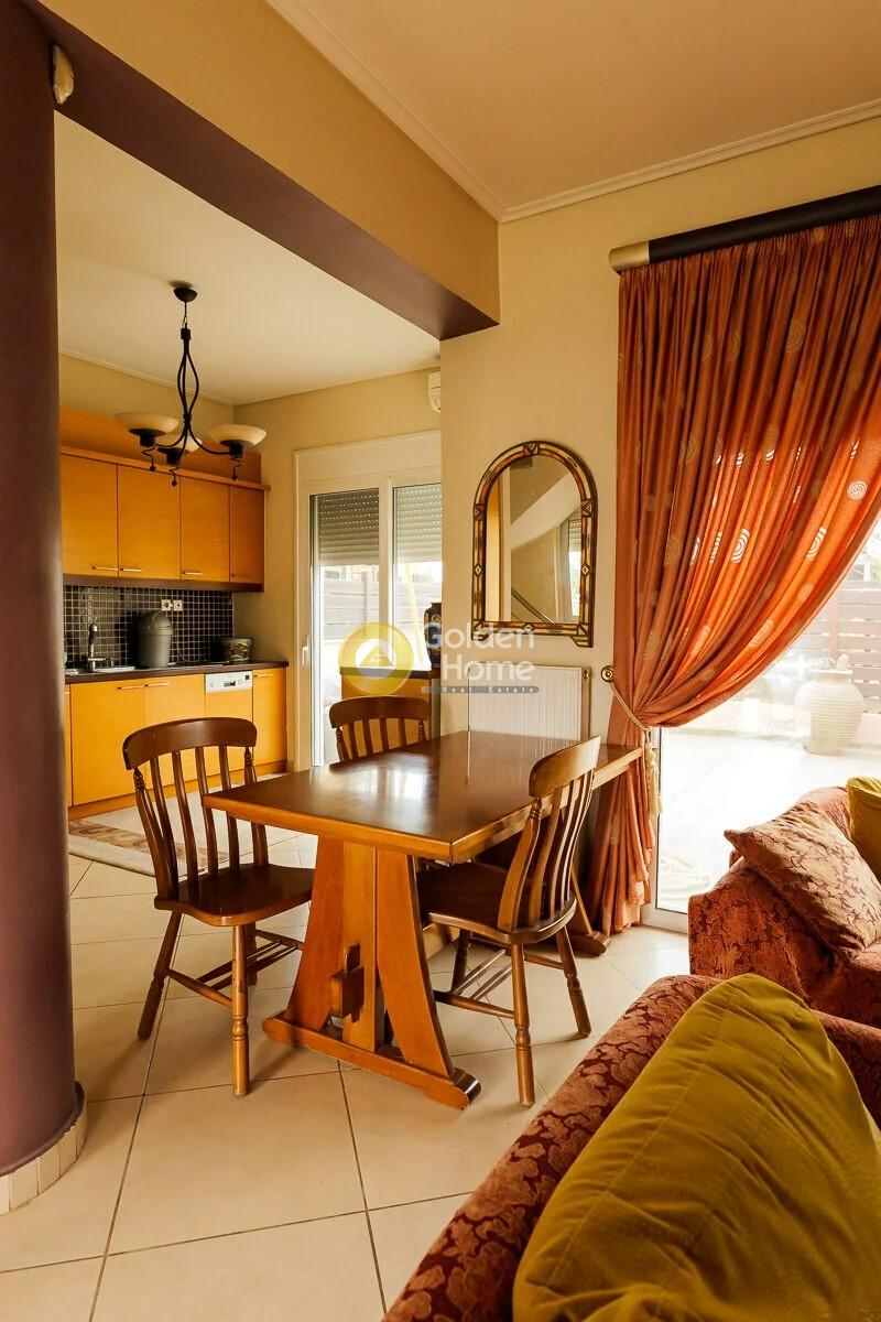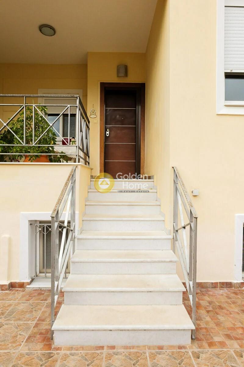 Η τριώροφη μεζονέτα αποτελεί τμήμα ενός συγκροτήματος πέντε μεζονετών και βρίσκεται στην ομορφότερη και ακριβότερη περιοχή της Κορίνθου, σε μία ήσυχη γειτονιά στον Αγιο Γεώργιο. Σε απόσταση αναπνοής βρίσκεται το 14ο Δημοτικό Σχολείο Κορίνθου, το 4ο Γενικό Λύκειο Κορίνθου, η πλατεία καθώς κι εμπορικά καταστήματα. Ο Αγιος Γεώργιος απέχει περίπου 2 χλμ. από το κέντρο της Κορίνθου και 3 χλμ. από τον προαστιακό σιδηρόδρομο. Μια από τις πιο όμορφες παραλίες της Κορίνθου την παραλία 5 Φ μπορεί κάποιος να φτάσει σε 7 - 8 λεπτά με τα πόδια. Το ακίνητο αναπτύσεται σε τρία επίπεδα. Στο ισόγειο βρίσκεται το πολύ φωτεινό σαλόνι με ενιαία τραπεζαρία καθώς και το τζάκι. Σε ενιαίο χώρο βρίσκεται επίσης η κουζίνα με ποιοτικά δρύινα έπιπλα κουζίνας και ο χώρος του καθημερινού φαγητού. Από την κουζίνα υπάρχει πρόσβαση στην μικρή αυλή στη βορινή πλευρά. Στον πρώτο όροφο υπάρχουν δύο υπνοδωμάτια (παιδικά) με μπαλκόνι, ένα υπνοδωμάτιο (γονέων) με ημιυπαίθριο χώρο - μπαλκόνι στη νότια πλευρά και το μεγάλο μπάνιο με μπανιέρα. Ολα τα δωμάτια όπως κι ο ημιυπαίθριος έχουν μεγάλες ντουλάπες σε δρύινη απόχρωση. Το υπόγειο αποτελεί από μόνο του μια μικρή κατοικία με εμβαδό 70 τ.μ. Είναι πολύ φωτεινό, έχει πολύ καλή σταθερή θερμοκρασία χειμώνα - καλοκαίρι και ντουλάπες σε δρύινη απόχρωση. Στο υπόγειο υπάρχει το δεύτερο μπάνιο του σπιτιού με διαμορφωμένη θέση ντουζ. Στο χώρο του υπογείου υπάρχουν επίσης αποθηκευτικοί χώροι με ράφια καθώς επίσης ο χώρος για τον καυστήρα, τη δεξαμενή πετρελαίου και το μπόιλερ. Τα τρία επίπεδα συνδέουν δύο μαρμάρινες σκάλες επενδεδυμένες με μάρμαρο Νάξου. Στο σπίτι υπάρχει αυτόνομη θέρμανση η οποία μπορεί να ενεργοποιηθεί και να ρυθμιστεί ανά όροφο. Στα τρία υπνοδωμάτια και στο χώρο της κουζίνας υπάρχουν επίσης κλιματιστικές μονάδες. Για το ζεστό νερό υπάρχει στη διάθεση των κατοίκων του σπιτιού ηλιακός θερμοσίφωνας, μπόιλερ μέσω του συστήματος θέρμανσης καθώς και ηλεκτρικός θερμοσίφωνας. Το σπίτι βρίσκεται ενεργειακά σε πολύ καλή κατηγορία. Τα κουφώματα είναι της εταιρείας Europa και έχουν διπλούς υαλοπίνακες. Για την ασφάλειά σας φροντίζει ένα σύστημα συναγερμού καθώς και μια πόρτα ασφαλείας Dierre. Στο υπόγειο υπάρχει επίσης μία στεγασμένη θέση στάθμευσης, η οποία κλείνει με γκαραζόπορτα - ρολό. Το σπίτι είναι ιδανικό και για επενδυτές καθώς είναι μισθωμένο