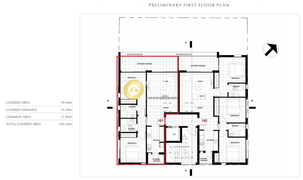 78m2 Covered area / 16,60m2 Cov. veranda / 11,80m2 Common area / 106,40m2 Total cov. area LOCATION : Geroskipou, Paphos / On the outskirts of Paphos Town / Central location / Easy access to all amenities, facilities and services / Close to schools, blue flag-awarded beaches, resorts, golf courses, places of interest, tourist atractions and the Paphos Harbour and promenade DESCRIPTION : The residences are of exceptional aesthetic design and consist of spacious apartments with large balconies, terraces and covered parking. These properties are set in a quiet convenient location and only few minutes’ drive from Paphos Town Center and the shops, Iasis hospital, the Neapolis University of Paphos and just ten minutes’ drive to Paphos International Airport. Ideal as a permanent residence offering 2 and 3 bedroom luxury apartments and integrated features such as, private and public gardens, covered parking and a lift.