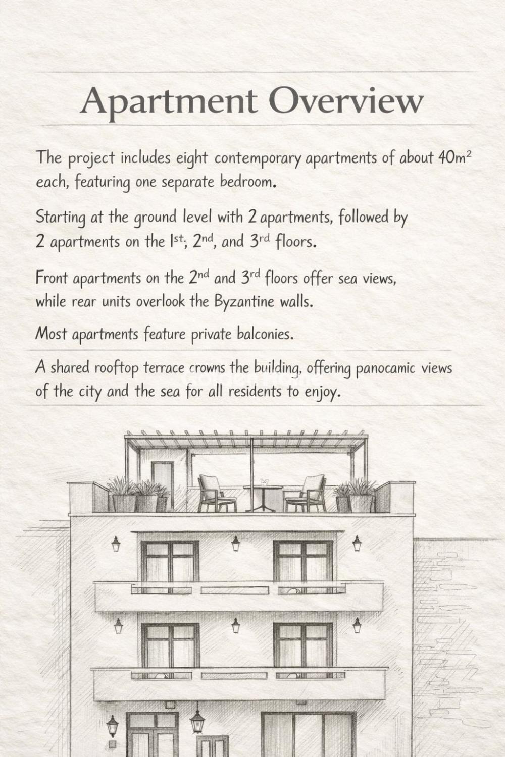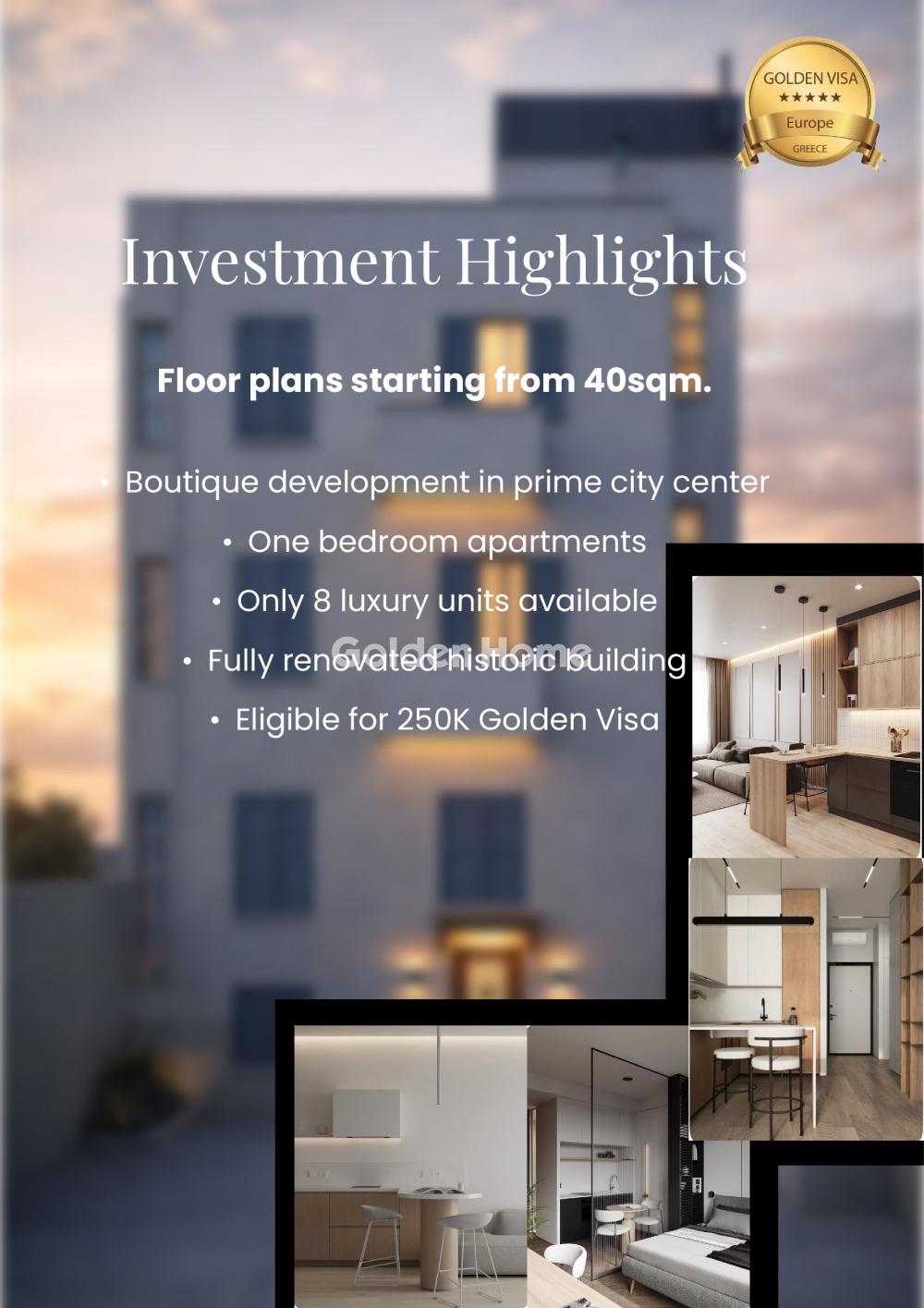 Boutique Πολυτελή Διαμερίσματα στο Κέντρο Θεσσαλονίκης | Επενδυτική Ευκαιρία Στην καρδιά της Θεσσαλονίκης, διατίθενται προς πώληση μοναδικά διαμερίσματα,επιφάνειες από 40 τ.μ. έως 50 τ.μ. 1 υπνοδωματίου σε πλήρως ανακαινισμένο ιστορικό κτίριο υψηλής αισθητικής. Πρόκειται για ένα exclusive boutique project μόλις 8 κατοικιών, που συνδυάζει τον χαρακτήρα του παρελθόντος με σύγχρονες προδιαγραφές διαβίωσης. Το κτίριο ανακαινίζεται με απόλυτο σεβασμό στην ιστορικότητά του, προσφέροντας ταυτόχρονα σύγχρονη άνεση και υψηλή αισθητική. Εντυπωσιακή κοινόχρηστη ταράτσα 70 τ.μ. Μοντέρνα πέργκολα. Πανοραμική θέα σε πόλη και θάλασσα Εξοπλισμός & Ποιότητα: Πλήρως επιπλωμένα & εξοπλισμένα (turn-key) Κλιματισμός Συναγερμός Εντοιχισμένες ηλεκτρικές συσκευές Επώνυμα υλικά υψηλής ποιότητας Εντοιχισμένες ντουλάπες Πόρτα ασφαλείας Σύγχρονα συστήματα ηλεκτρολογικών & υδραυλικών Επενδυτική Αξία: Επιλέξιμο για Golden Visa (250.000€) Premium τοποθεσία με μεγάλη ζήτηση Επικοινωνήστε για διαθεσιμότητα & περισσότερες πληροφορίες.