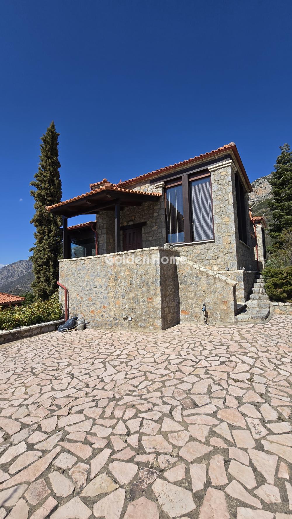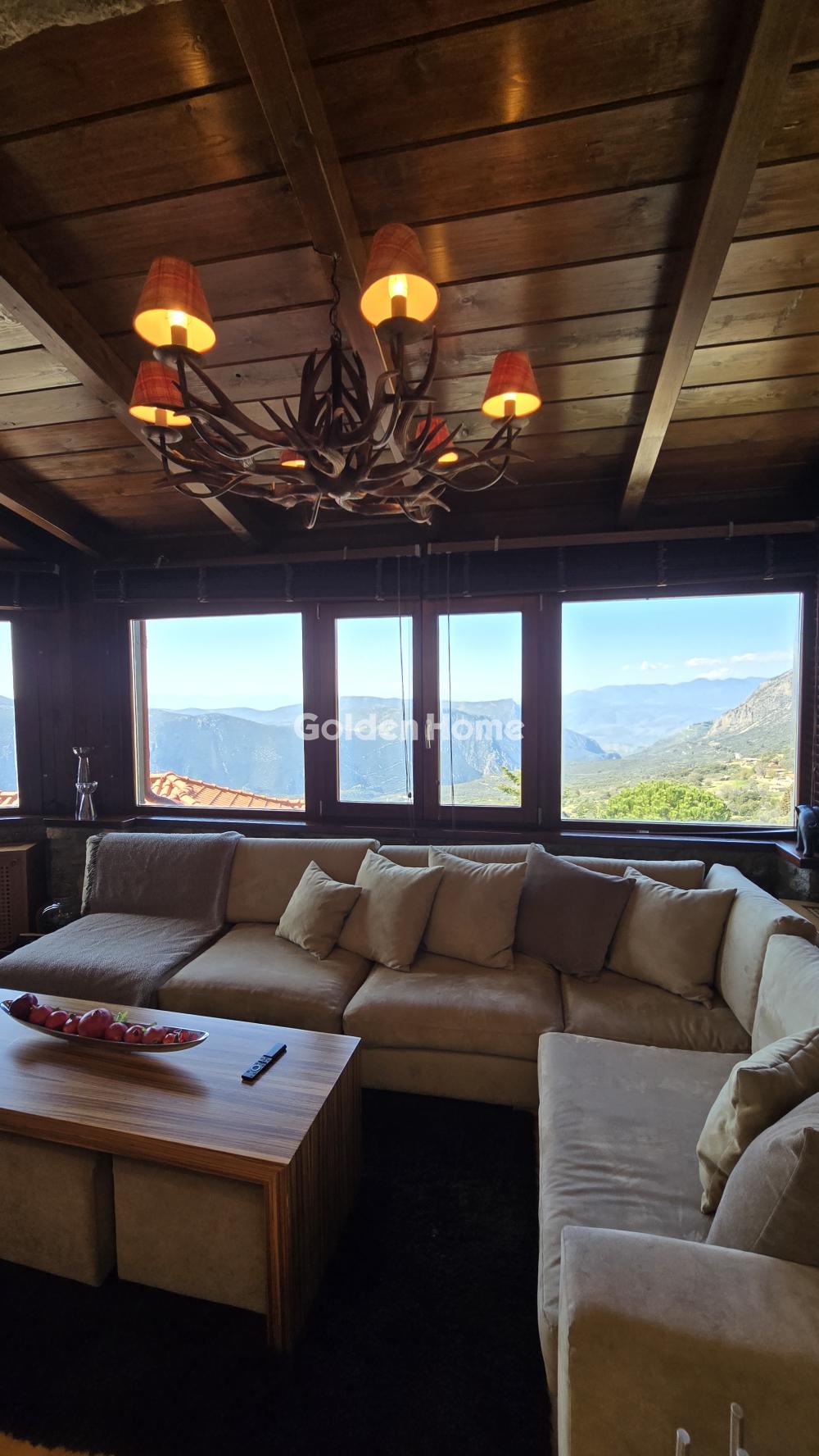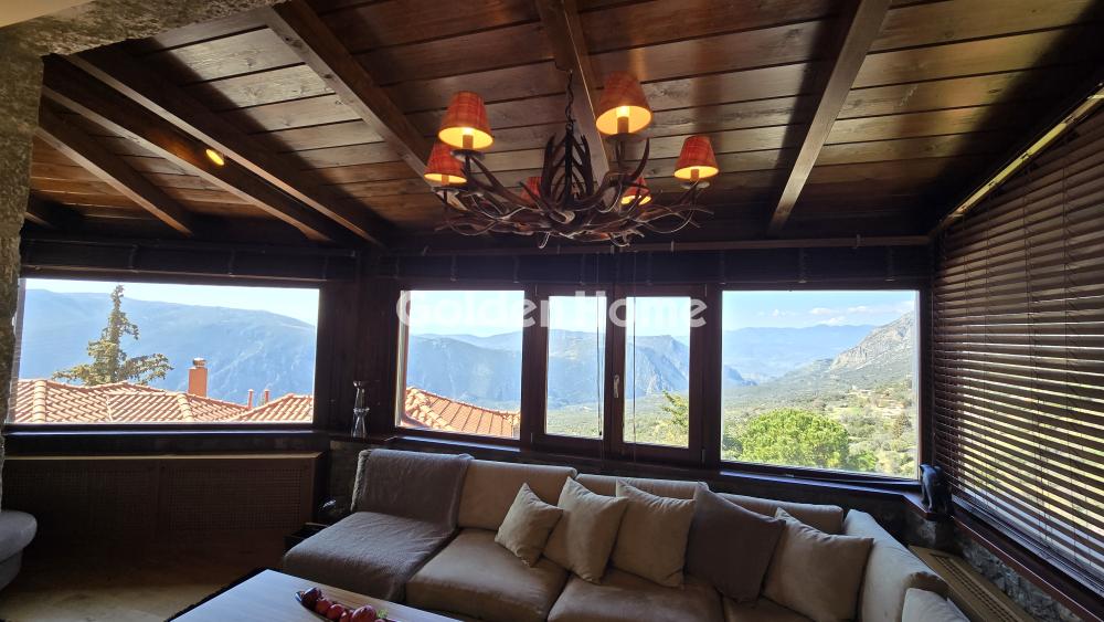 ΒΟΙΩΤΙΑ ΑΡΑΧΩΒΑ ΜΕ ΘΕΑ ΤΟ ΔΕΛΦΙΚΟ ΤΟΠΙΟ ΠΩΛΕΙΤΑΙ πολυτελής εφαπτόμενη μεζόνετα 168τμ, με 3 μάστερ υπνοδωμάτια, 3 μπάνια συνολο, 1 WC στο ισόγειο, κου΄ζίνα ενιαία με καθιστικό και σαλόνι, σ ενα απο τα καλύτερα σημεια της Αράχωβας. Το πέτρινο σαλέ βρίσκεται σε επικλινές οικόπεδο και διαιρείται σε 3 επίπεδα. Στο πάνω επίπεδο είναι η αυτόνομη σοφίτα με χώρο καθιστικού, τζάκι και δικό της μπάνιο. Με την εσωτερική σκάλα οδηγούμαστε στο επίπεδο της κουζίνας με τα μεγάλα παράθυρα και την υπέροχη θέα στον Παρνασσό. Απο το καθιστικό με το τζάκι απολαμβάνεις θέα προς το Δελφικό τοπίο! Κατεβαίνοντας στο ισόγειο ειναι τα 2 μάστερ υπνοδωμάτια με άμεση πρόσβαση στον κήπο. Στο ίδιο επίπεδο υπάρχουν βοηθητικοί χώροι αποθήκευσης. Στον περιβάλλοντα χώρο του σαλέ περιλαμβάνεται περίπου 200τμ οικόπεδο με ανεμπόδιστη θέα σε Παρνασσό και Δελφικό τοπίο. Το σαλέ βρίσκεται μόλις 5 λεπτά απόσταση με το αυτοκινήτο απο το κέντρο της Αράχωβας.
